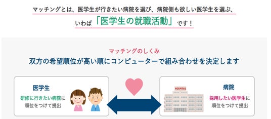 医学生が行きたい病院を選び、病院側も欲しい医学生を選ぶ「医学生の就職活動」を支える仕組みのことです。マッチングは、公益財団法人医療研修推進財団が運営する「初期研修マッチング協議会」のWebサイトにおいて、医学生と病院のお互いの希望をふまえて、一定の規則に従って、オンラインで行われます。その仕組みは、双方の希望順位が高い順にコンピューターで、組み合わせを決定します。(▶マッチングまでの道のり参考)