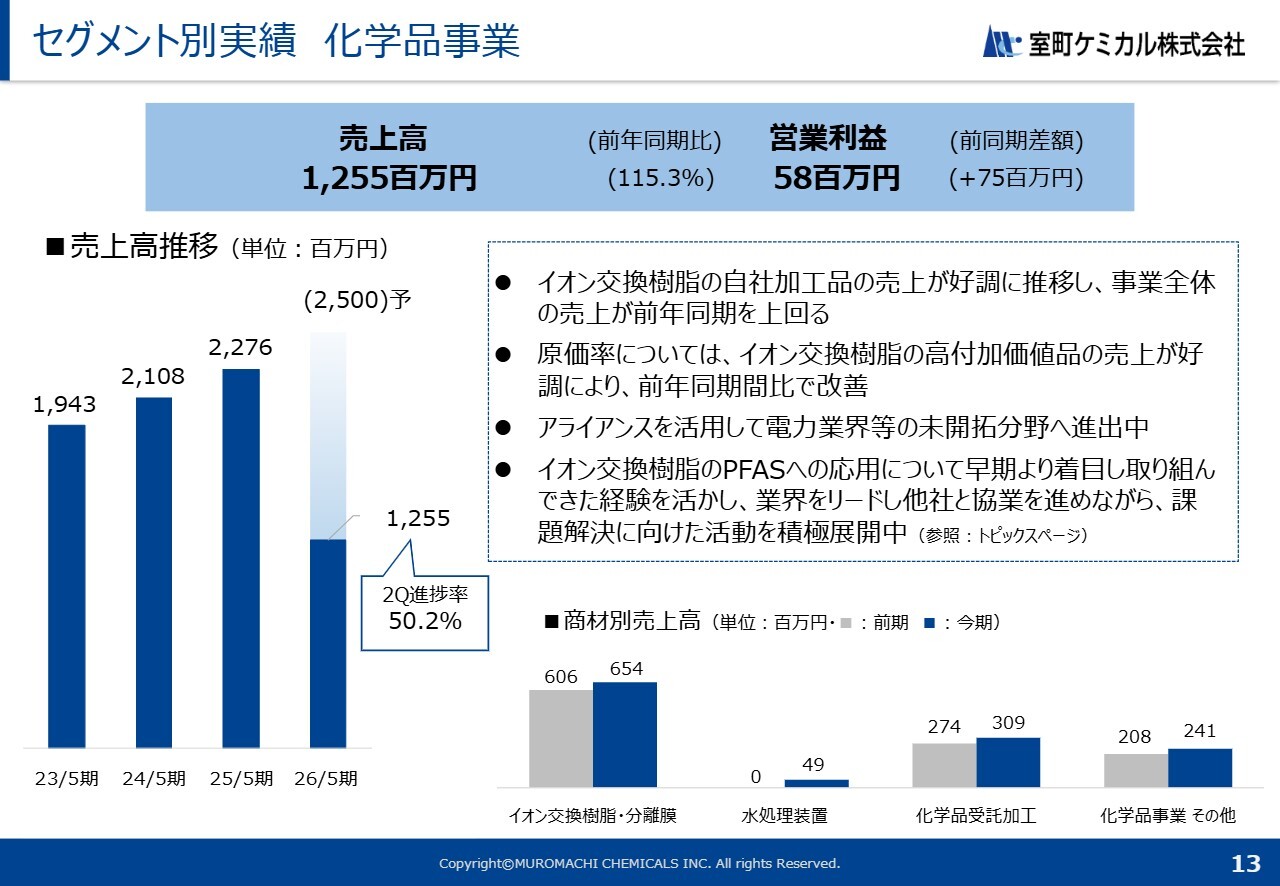化学品事業については、売上高12億5,500万円、営業利益5,800万円となっています。通期の売上予想に対する進捗率は50.2パーセントです。