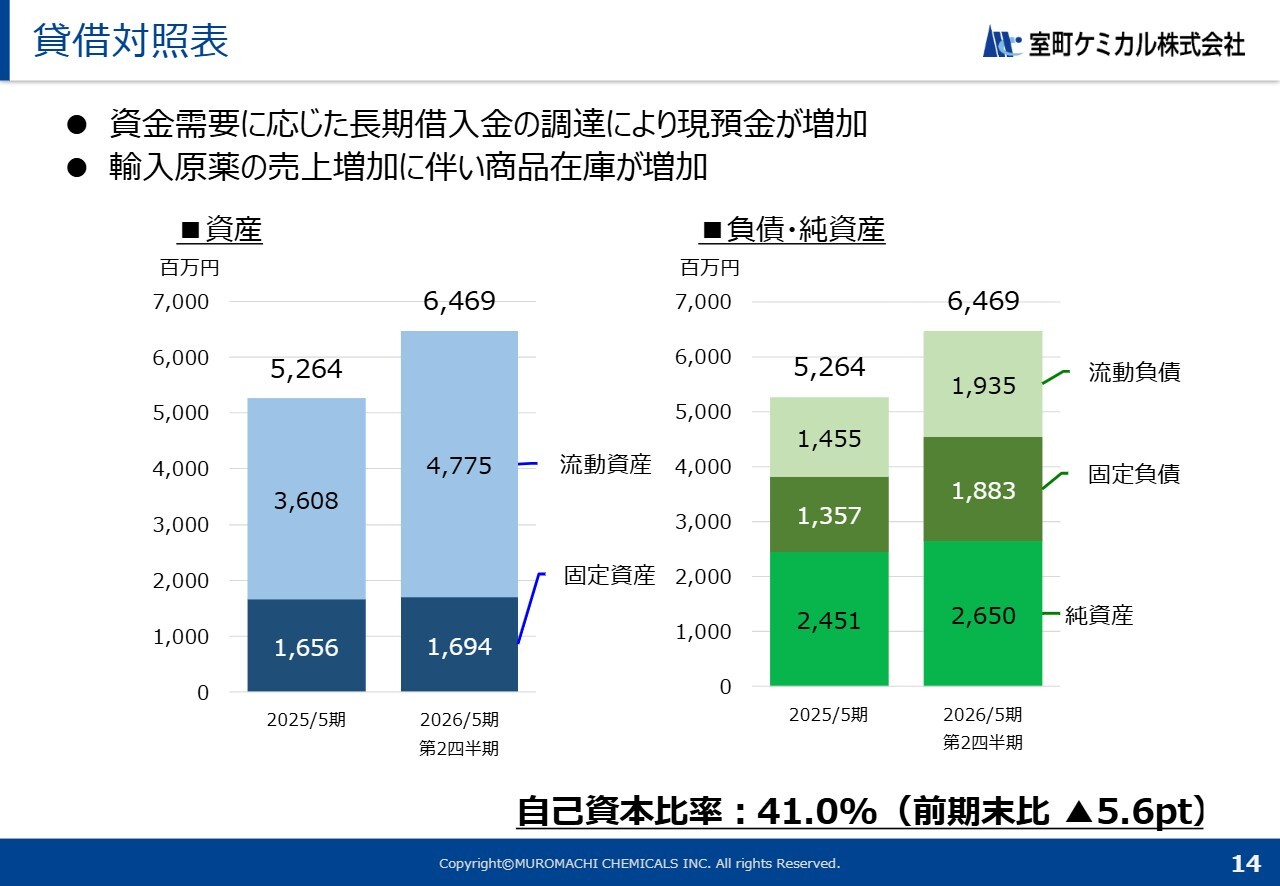 貸借対照表上の動きについてご説明します。資金需要に対応するため、長期借入金の調達を行った結果、現預金が増加しています。また、輸入原薬の売上増加に伴い、商品在庫が増加しています。