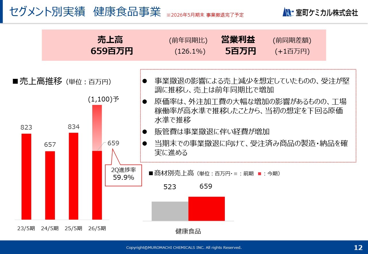 最後に、健康食品事業において、当初、事業撤退に伴い受注がある程度減少するだろうと予想していました。しかし、想定を上回る、切り替えのための在庫を持ちたいという要望が多く寄せられたことで、生産が増え、販売も増加しました。以上の順序で影響が大きかったと見ています。