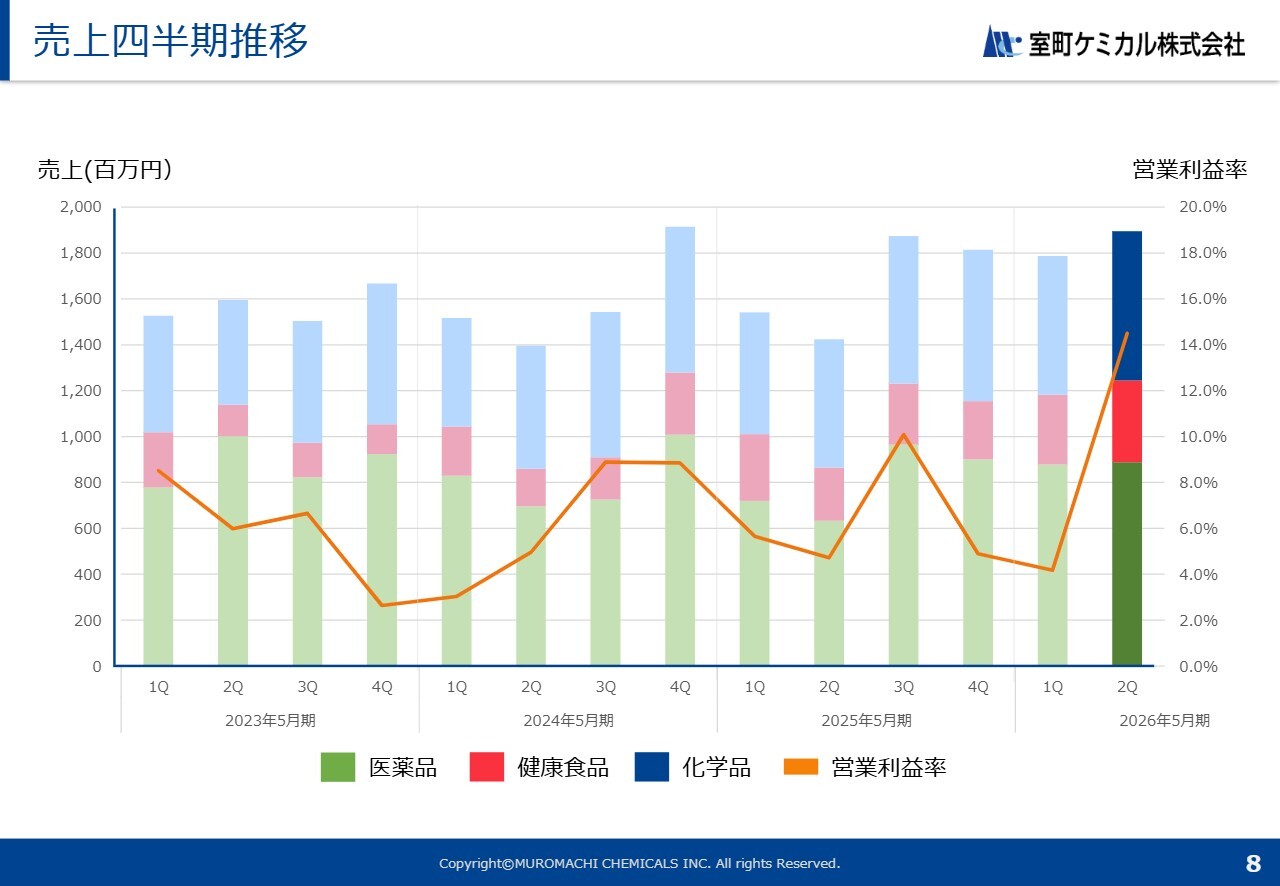 売上が好調であった要因として、まず健康食品事業からの撤退に伴い、お客さまの在庫確保を主目的とした受注が増加した点が挙げられます。また、医薬品事業では、一部の輸入原薬において大幅な伸びが見られた点、そして化学品事業ではイオン交換樹脂の販売が拡大し、好調である点が挙げられます。