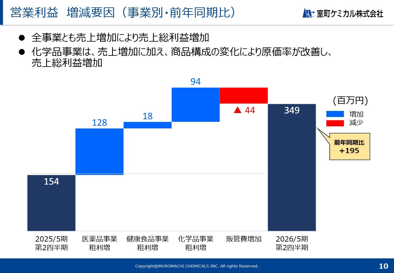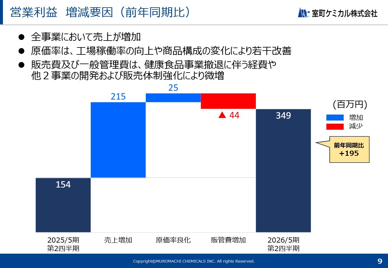 営業利益は、前年同期比で1億9,500万円増加しました。全事業で売上が増加したことに加え、工場稼働率の向上や商品構成の変化により原価率が若干改善したことで、売上総利益が増加しています。