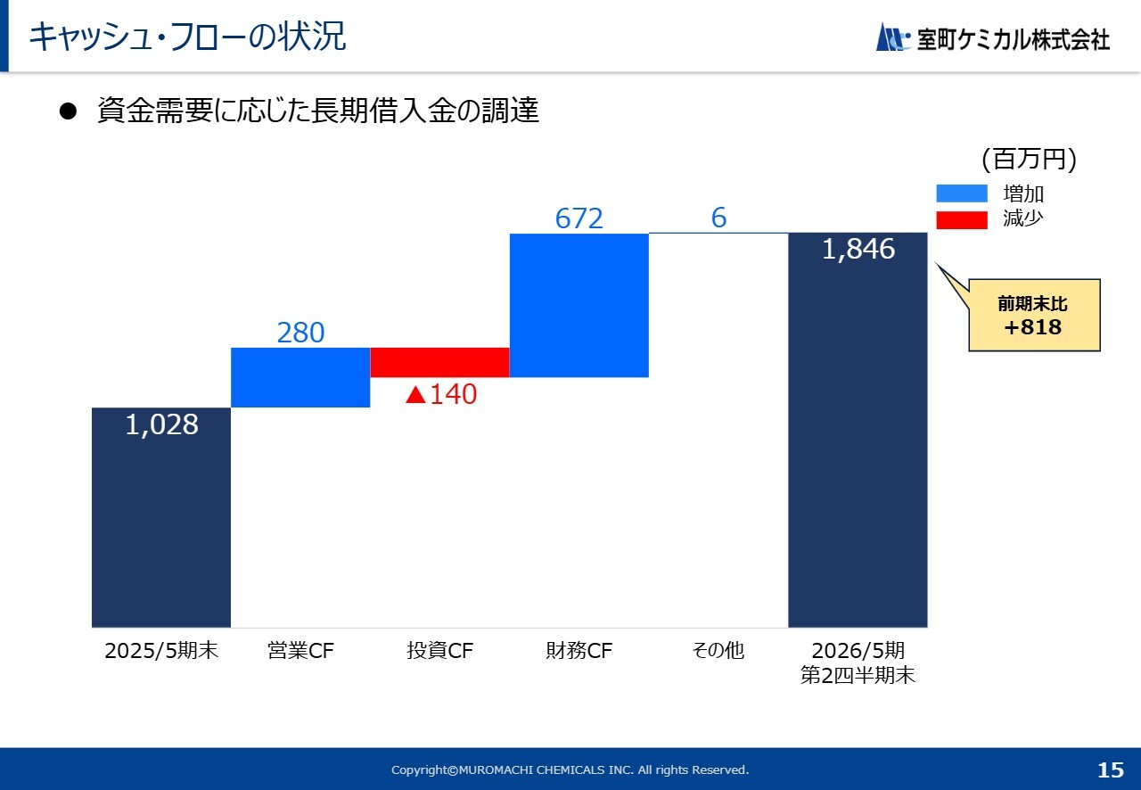 キャッシュ・フローの状況についてご説明します。現金および現金同等物の期末残高は、前期末比で8億1,800万円増加しました。
