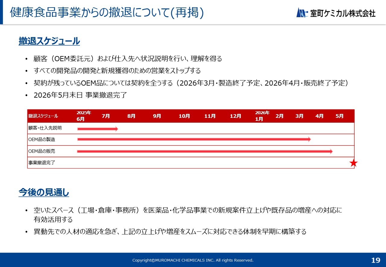 事業撤退の発表以降、当初の想定を超えて受注が増加しました。これにより、製造や販売終了のスケジュールに多少のずれが生じていますが、最終的な撤退完了時期は当初のスケジュールどおり本年5月末となり、この終了時期に変更はありません。