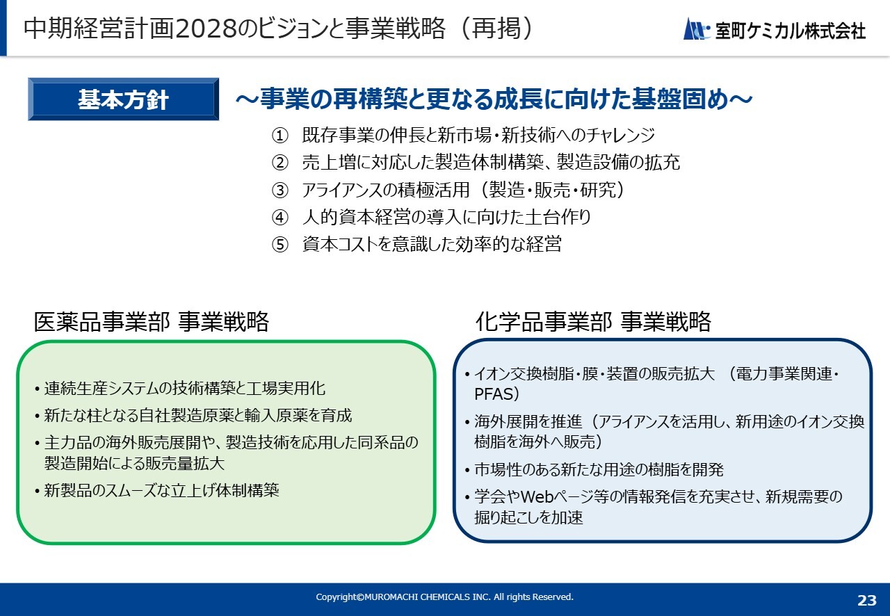 中期経営計画の進捗についてです。「中期経営計画2028」の基本方針として、スライドに記載の5項目を掲げています。「事業の再構築とさらなる成長に向けた基盤固め」として、この5項目を意識した事業運営を推進しています。