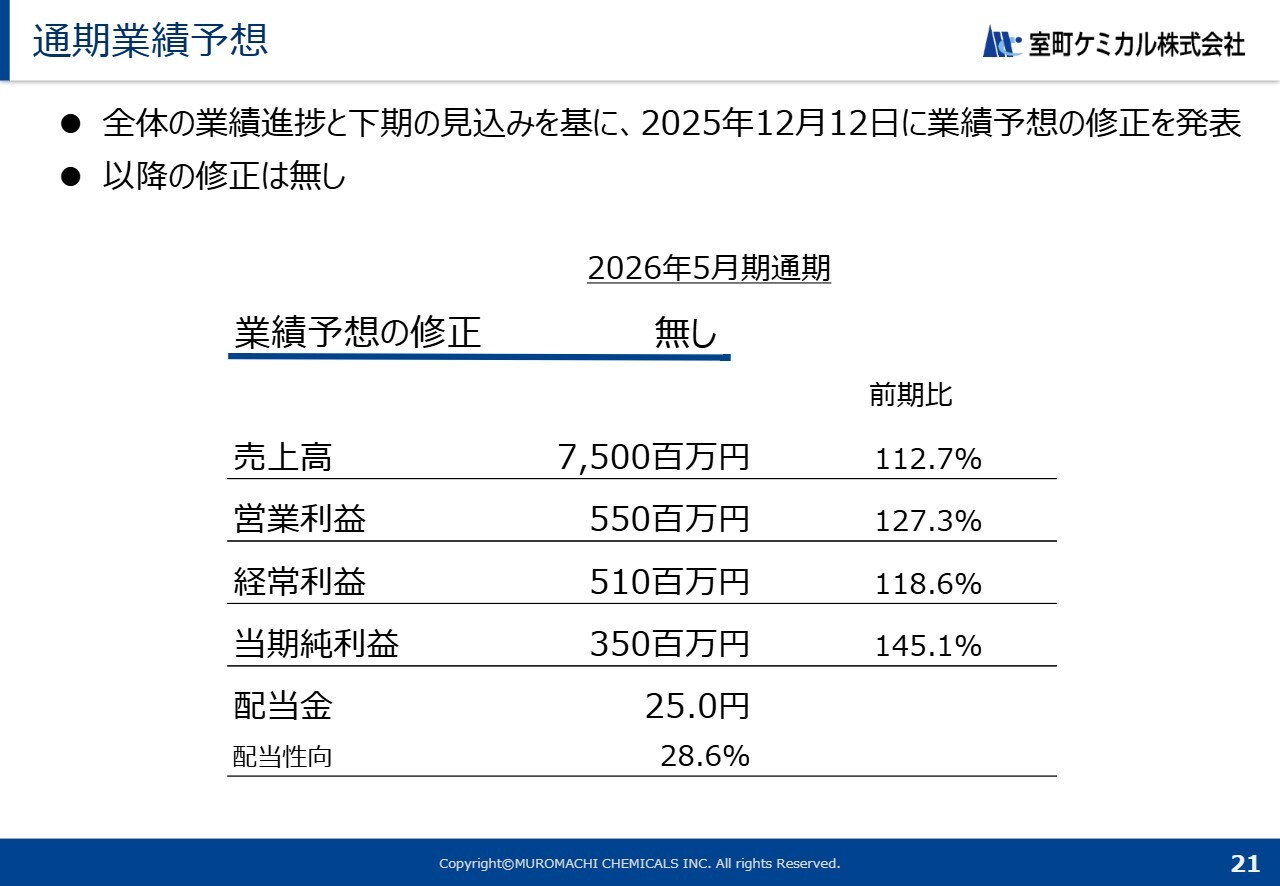 2026年5月期の業績予想についてご説明します。現時点における通期の業績予想は、2025年12月12日に発表した内容から変更はありません。引き続き対応を進めていきます。