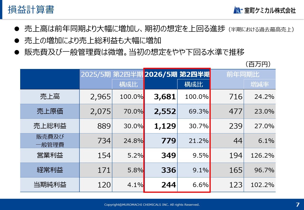 原価率については、外注加工費の大幅な増加の影響がありましたが、工場稼働率が高水準を維持したため、当初の想定を下回る原価水準で推移しました。販管費については、事業撤退に伴う経費により増加しました。