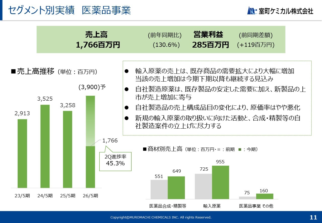 まず、医薬品事業においては、売上高が17億6,600万円、営業利益が2億8,500万円となり、増収増益を達成しました。通期売上予想に対する進捗率は45.3パーセントです。