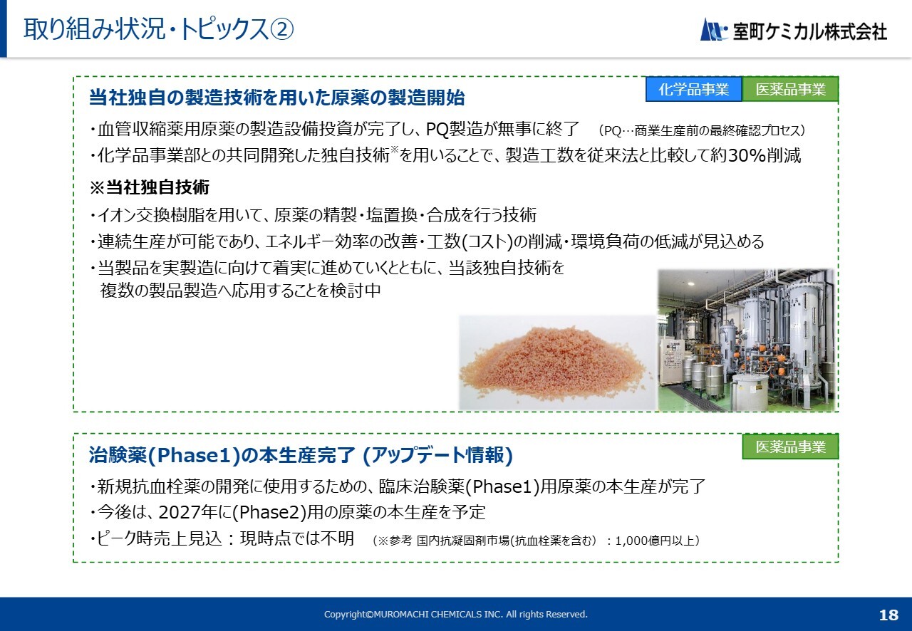 その他のトピックスです。まず、医薬品事業では血管収縮薬用原薬の製造設備投資が完了し、PQの製造まで無事に終了しました。