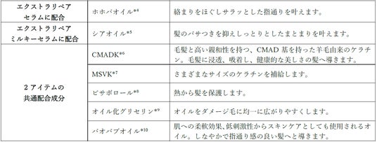 *1 エルジューダブランド内での比較 *2 加水分解ケラチン(羊毛)[毛髪補修成分] *3 ジメチコン[毛髪保護成分] *4 ホホバ油[毛髪保護成分] *5 シア脂油[毛髪保護成分] *6 カルボキシメチルアラニルジスルフィドケラチン(羊毛)[毛髪補修成分] *7 Multi-Sized Versatile Keratinの略称、加水分解ケラチン(羊毛)[毛髪補修成分] *8 ビサボロール[毛髪保護成分] *9 ポリグリセリル-3ポリジメチルシロキシエチルジメチコン[毛髪保護成分、毛髪保湿成分]