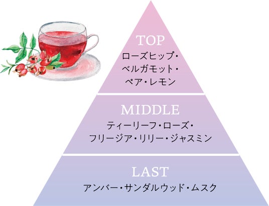 ● 香りはローズヒップティーを基調とした高級感があり、心安らぐひとときにぴったりの香りです。