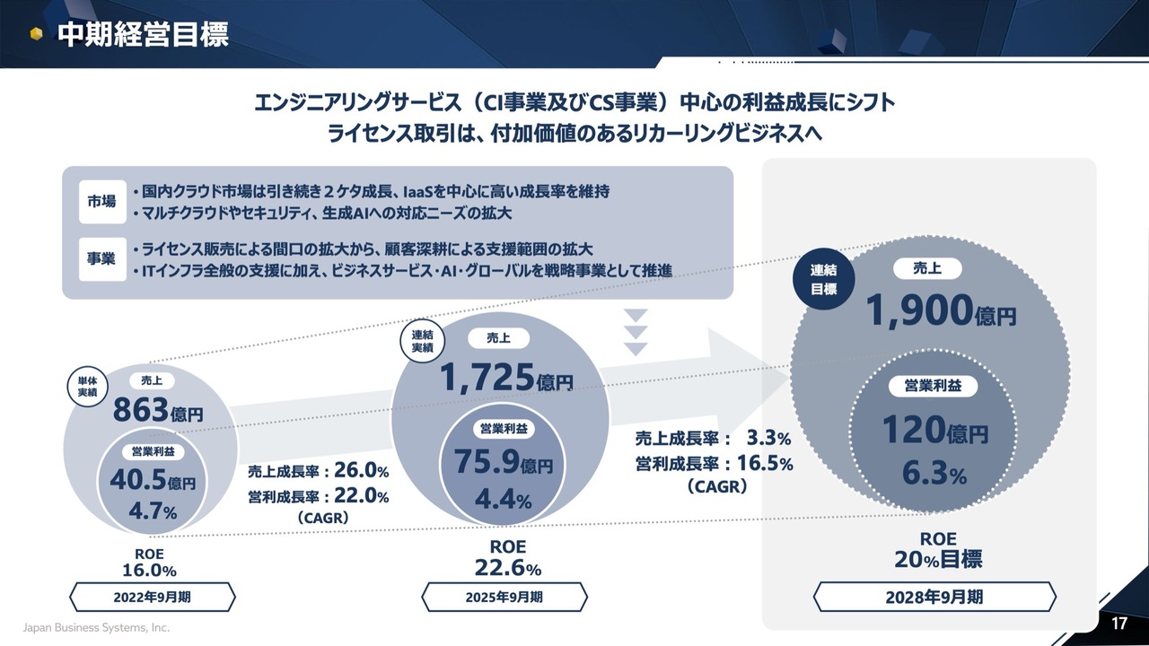 上坂貴志氏(以下、上坂):専務執行役員の上坂です。中期経営目標についてご説明します。これまでの戦略をさらに加速させ、エンジニアリングサービスであるクラウドインテグレーション事業、クラウドサービス事業へのシフトを進めます。また、ライセンスの取引に付加価値を持たせ、リカーリングビジネスへ発展させていく計画です。