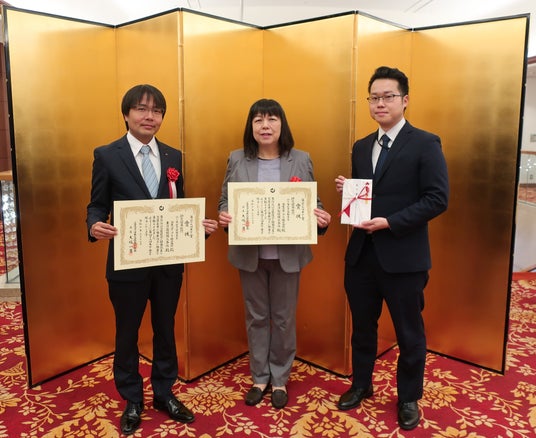 6月13日(金)に行われた「第49回木下賞」受賞式の記念写真 (左から、東洋製罐 テクニカルセンター メタル技術開発部 副主査 中村友彦、日本コカ・コーラ ジャパン&サウスコリアオペレーティングユニット 技術・イノベーション・サプライチェーン本部 パッケージ シニアマネジャー 田中明子氏、東洋製罐 販売第八部 坂巻佑馬)