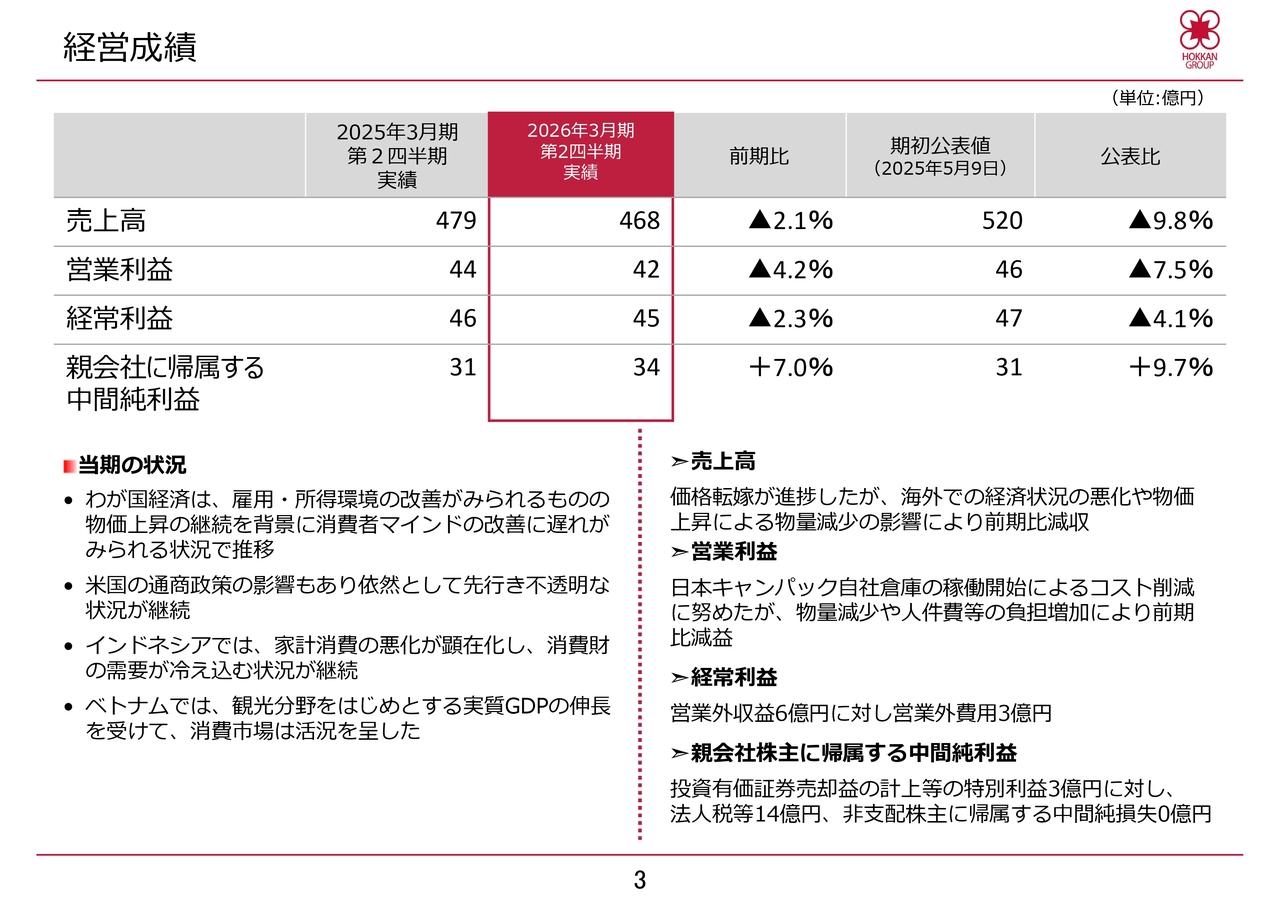 なお、当社およびグループの概要、ガバナンスやサステナビリティの状況については、本日は説明を割愛しますが、本説明会の資料にAppendixとして添付していますので、ぜひご一読ください。それでは、2026年3月期上半期の経営成績についてご説明します。