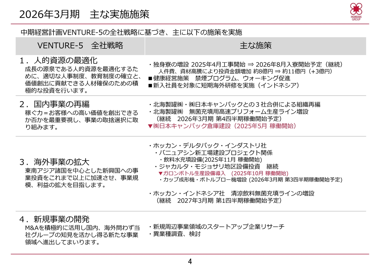 「VENTURE-5」の全社戦略に基づき、当期に決定・実施した主な施策を表にまとめています。人的資源の最適化、国内事業の再編、海外事業の拡大、新規事業の開発、それぞれの項目について慎重に、かつスピード感を持って実施していますが、このうち赤色で示している2件の施策についてご説明します。