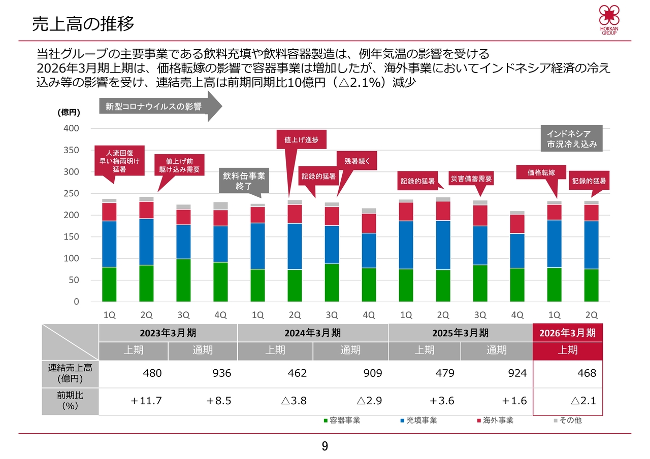 過去3年間および当第2四半期までの四半期ごとの売上推移について、スライドのグラフをご覧ください。当社グループの主要事業である充填事業や飲料容器製造の売上高は、例年天候、特に気温の影響を受けて増減します。