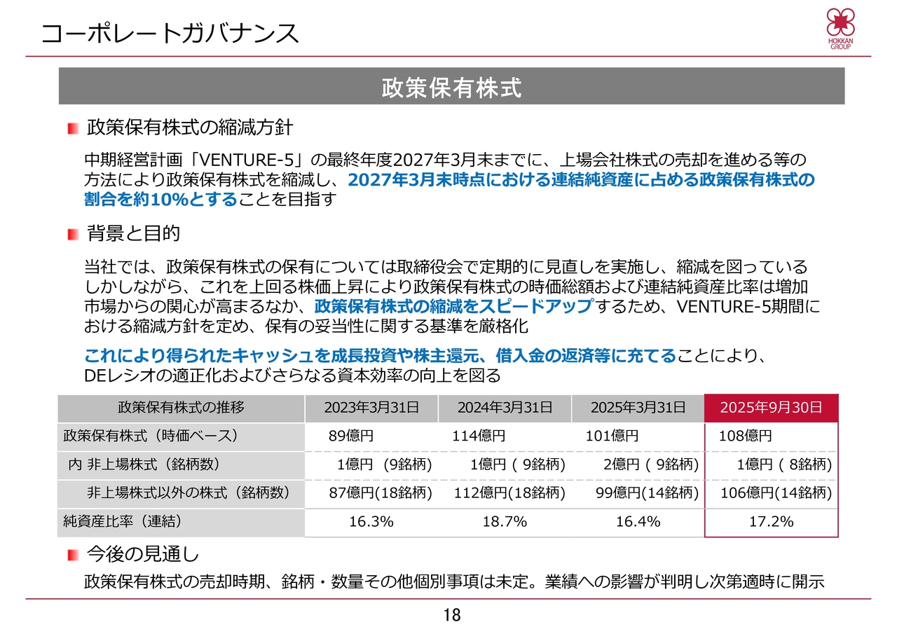最後に、株式の政策保有に関する方針についてご説明します。当社は政策保有株式の縮減方針を決定しており、「VENTURE-5」期間中に上場会社株式の売却を進めるなどの方法により、政策保有株式を縮減し、2027年3月末時点における連結純資産に占める政策保有株式の割合を約10パーセントとすることを目指しています。