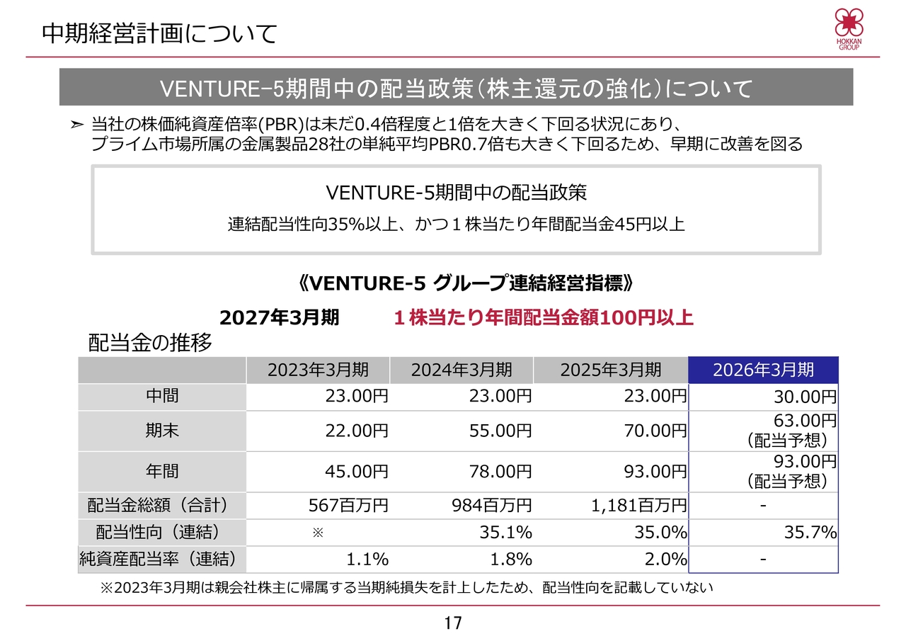 当社のPBRは依然として1倍を大きく下回る状況にあり、早期改善が必要と認識しています。当社はグループ全体で業績向上に取り組むとともに、さらなる株主価値の向上を図るため、「VENTURE-5」期間中の配当政策を連結配当性向35パーセント以上、かつ1株当たり年間配当金を45円以上と設定しています。