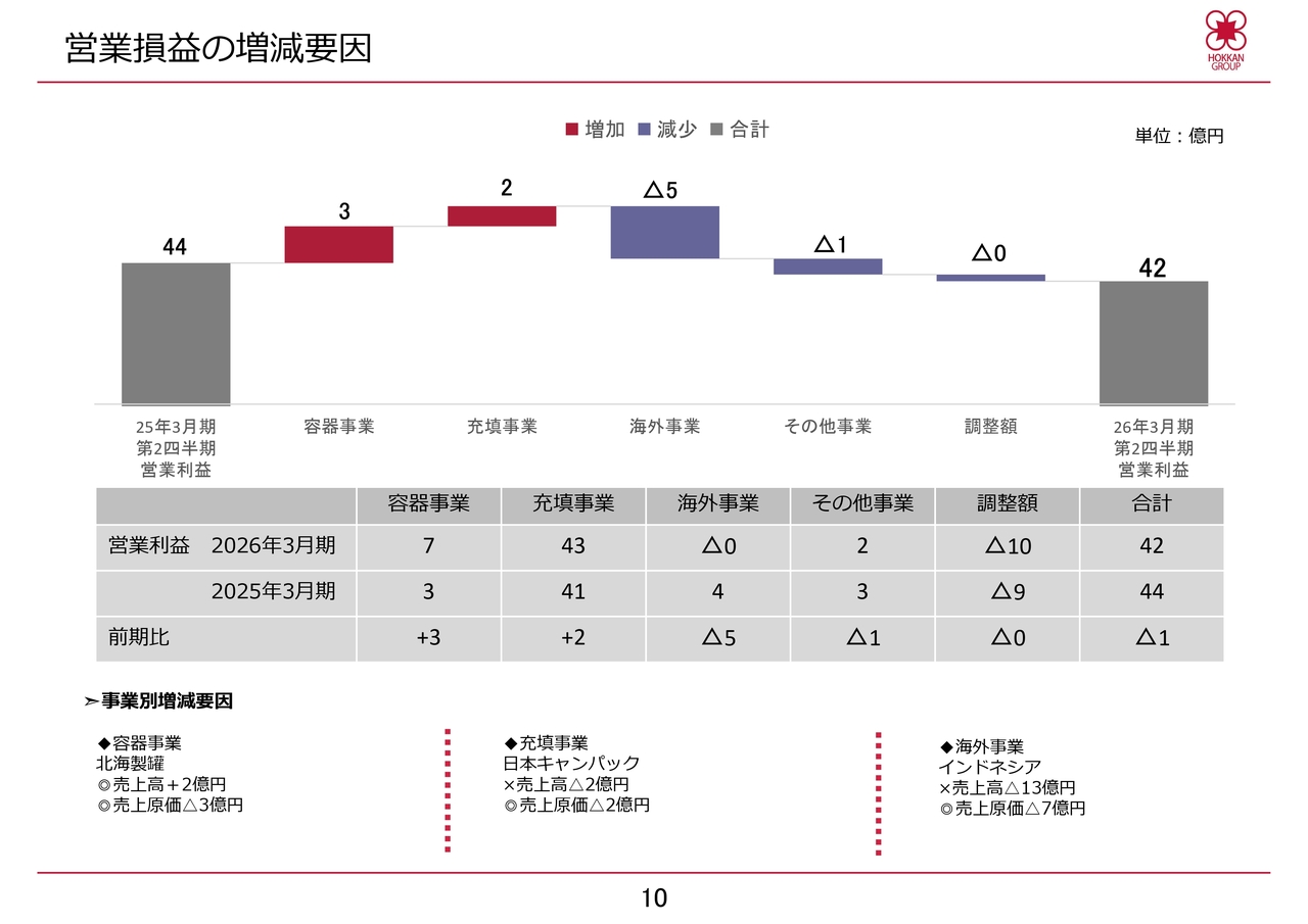 容器事業では、生産数量が減少したものの、価格改定により売上高が増加しました。また、原価低減の影響で営業利益は前年同期比で3億円増加しました。充填事業では、株式会社日本キャンパックにおいて売上高が3億円減少したものの、倉庫関連費用の削減やその他の原価低減施策により、営業利益は前年同期比で2億円増加しました。