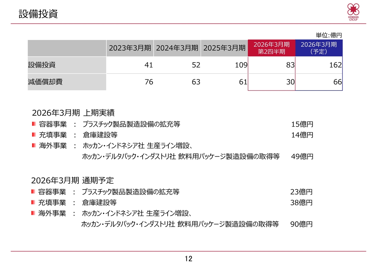 また、減価償却費は30億円を計上しています。2026年3月期通期においても主な投資内容に変わりはなく、容器事業で23億円、充填事業で38億円、海外事業で90億円と、総額162億円の設備投資を予定しています。減価償却費については、66億円となる見込みです。