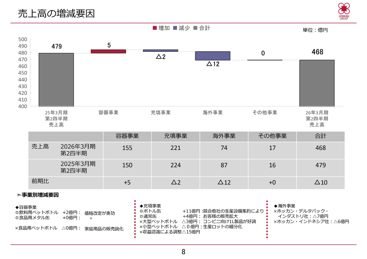 この結果、売上高は前年同期比で2億円減少しました。海外事業では、ホッカン・デルタパック・インダストリ社において、新規設備投資と営業活動の強化によるプリフォームの受注増加が見られましたが、主力製品であるカップ製品の市場が鈍化した影響を受けました。