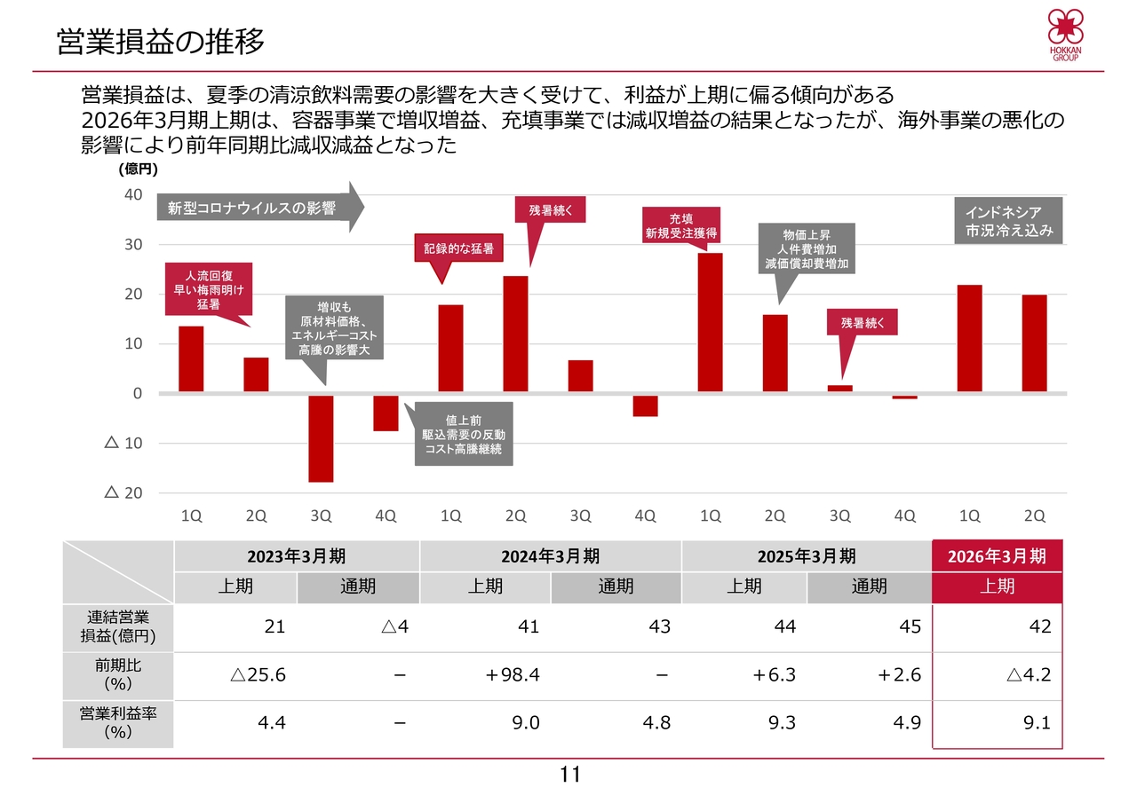 池田:事業別の利益率については、充填事業は上期の利益がかなり高い一方で、容器事業はそれほどでもないという状況です。一部ご説明した内容にもありますが、当社は特に飲料水や飲み物を主業としているため、当社の上期である4月から9月は需要の最盛期にあたり、この時期に利益が集中する傾向があります。