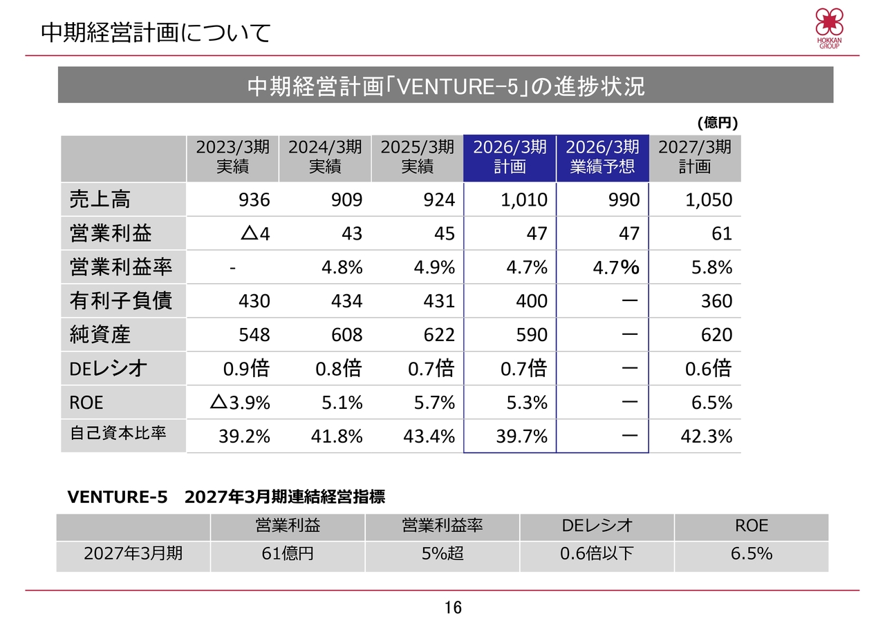 池田:引き続き、私から中期経営計画の進捗状況についてご説明します。こちらのスライドでは、「VENTURE-5」期間中の主要な指標の実績推移と計画を示しています。当期の計画と業績予想は青色の枠で表示しています。