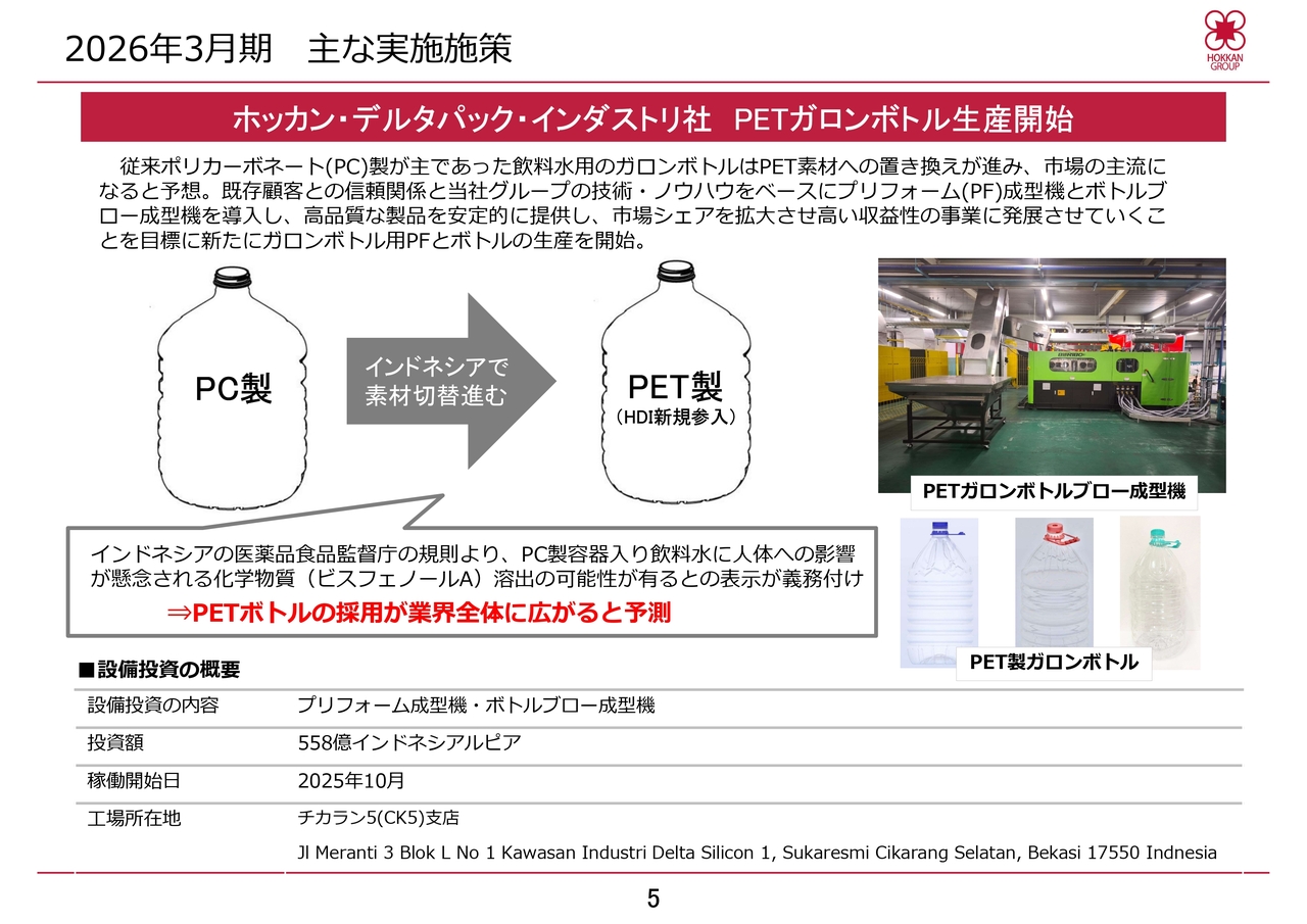 また、現在投資を進めているホッカン・デルタパック・インダストリ社のインドネシア事業は、来期以降に寄与してくると見込んでおり、これが成長を支える要因と考えています。