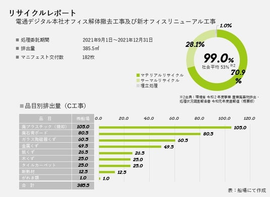 さらに、一部の案件では、中間処分以降のトレーサビリティにも取り組んでいます。「電通デジタル本社オフィス」の内装工事では、1次リサイクル率の集計のみでなく、船場が分別排出した廃棄物の最終処分会社での再資源化量の算出に成功。1次リサイクル率100%、最終リサイクル率99%を達成しました。