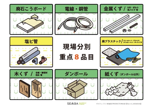 対話をしていく中で、工事現場から排出する際に廃棄物を素材ごとに細かく分別することで、その先の中間処分会社の負担を減らし、最終的にリサイクル率を高めることができると考え、2021年より廃棄物の分別排出を開始。8つの重点分別品目を掲げ、現場での分別を始めました。工事現場での分別の負担をできるだけ減らすため、協力企業と何度も試行錯誤を重ね、現在では、船場が施工を請け負う全ての現場で廃棄物の分別排出を行うことができるようになりました。