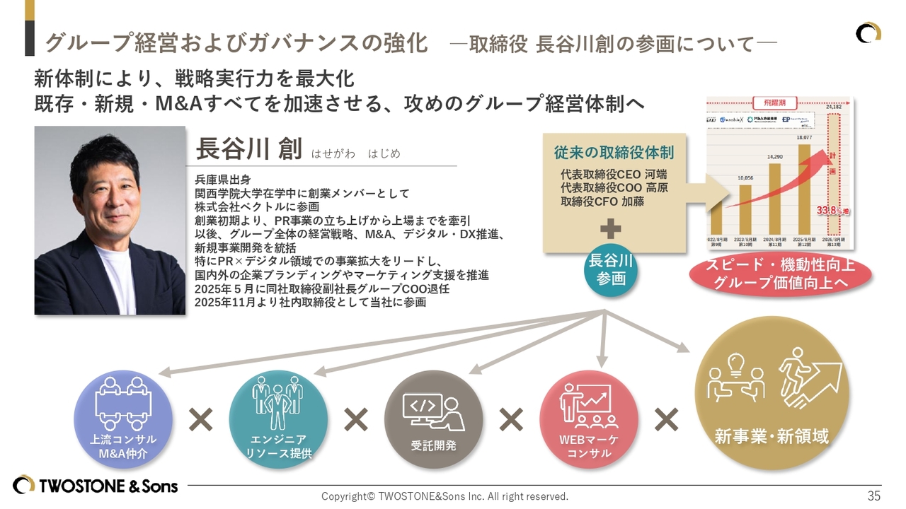 新事業・新領域については、まったく関係のない事業を展開するのではなく、既存のアセットを活用できる新領域を検討しています。社内取締役として長谷川が加わったことで、実現可能なケイパビリティや取り組める内容が非常に増えていますので、さらにこの動きを進めていきたいと考えています。