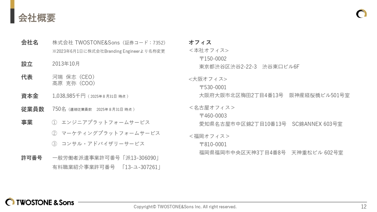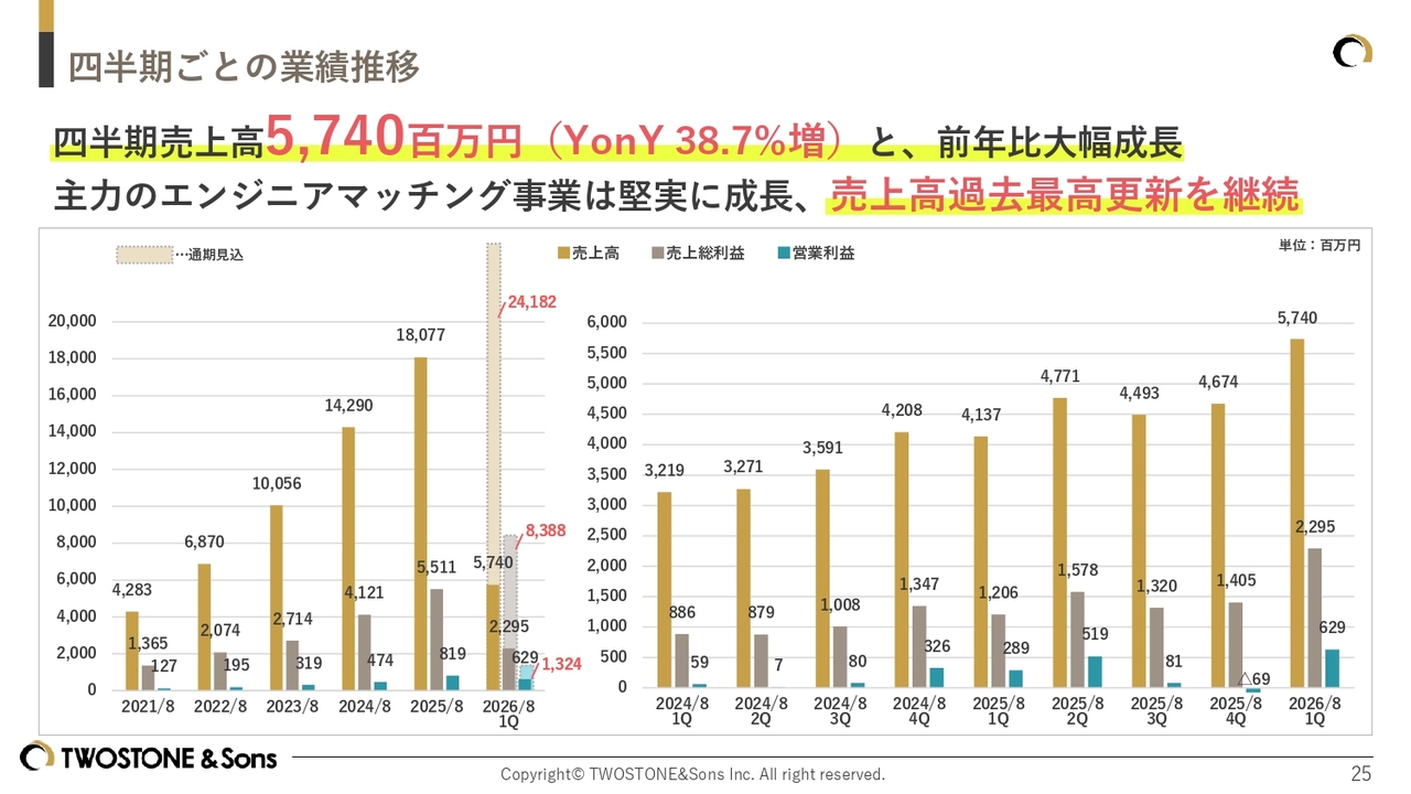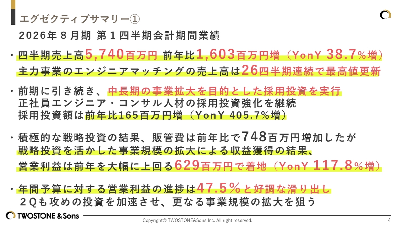 河端保志氏:株式会社TWOSTONE&Sons代表取締役CEOの河端保志です。本日はお忙しい中、決算説明会にご参加いただき、誠にありがとうございます。2026年8月期第1四半期の決算についてご説明します。