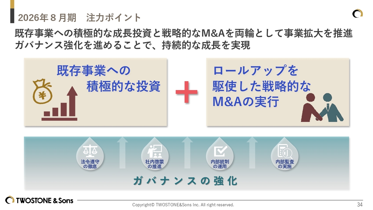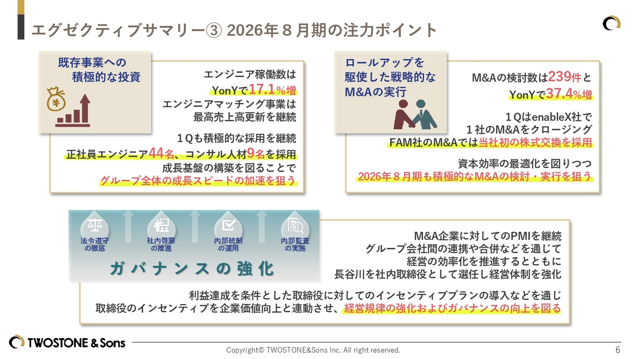 2026年8月期の注力ポイントとその進捗についてです。2026年8月期は「既存事業への積極的な投資」「ロールアップを駆使した戦略的なM&Aの実行」「ガバナンスの強化」の3つを注力ポイントとして挙げています。