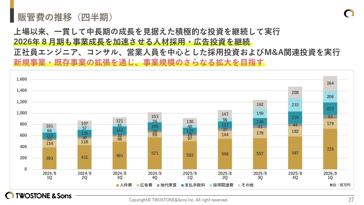 また、現在は認知度が非常に上がってきたこともあり、採用費は徐々に落ち着いてきています。さらに、会社の事業規模が拡大するにつれて、採用費の影響度は全体的に低下していくと考えています。