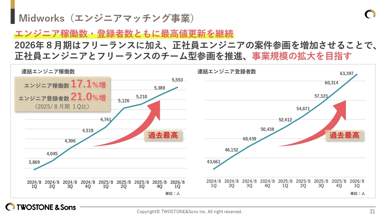 2026年8月期は得意とするフリーランス領域に加え、正社員エンジニアの案件参画を増加させ、正社員エンジニアとフリーランスによるチーム型参画を推進することで、事業規模の拡大を実現していきます。