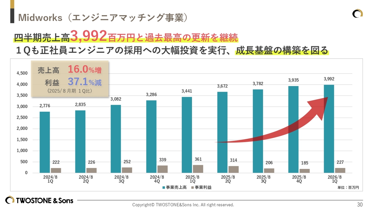 - TWOSTONE&Sons 2026年8月期 第1四半期決算発表 戦略投資を継続するも、営業利益は前年比117.8%増、計画進捗率47.5%と好調 2026/01/14