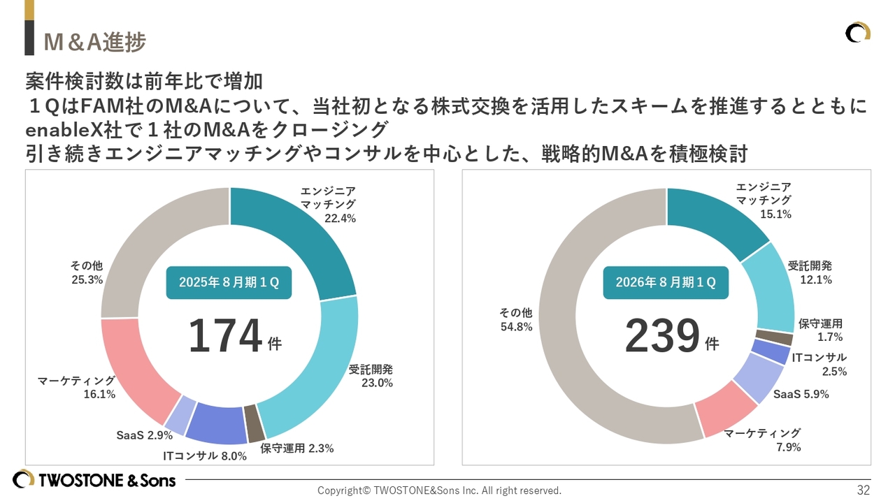 第1四半期には、enableX社における1件のM&Aのクロージングとともに、FAM社のM&Aを推進しました。FAM社のM&Aでは、当社初となる株式交換を採用し、資本効率の最適化を意識した戦略的なM&Aを実行できたと考えています。今後もM&Aの検討および実行を積極的に続けていきます。