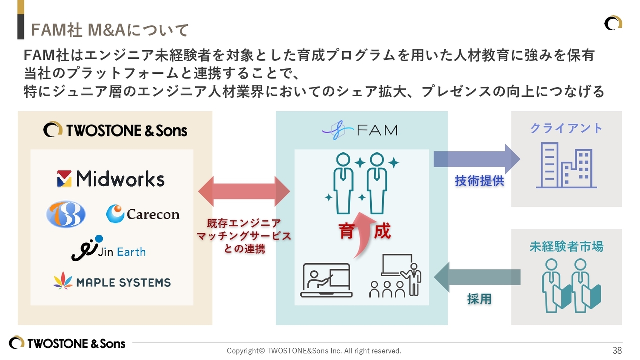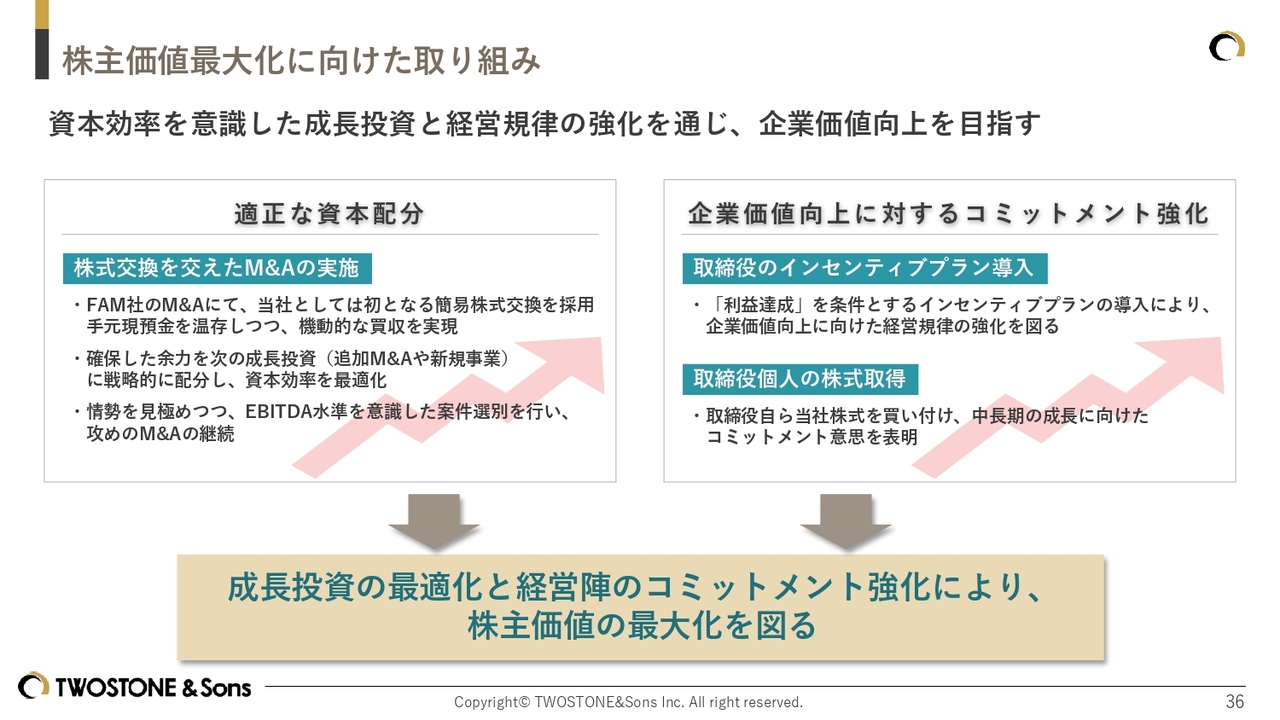 M&Aについては、2025年12月にFAM社のM&Aを実行しました。FAM社のPL連結は2026年8月期第2四半期からを予定しています。引き続き、自社の周辺領域におけるロールアップM&Aを中心に、戦略的なM&Aの加速を目指していきます。