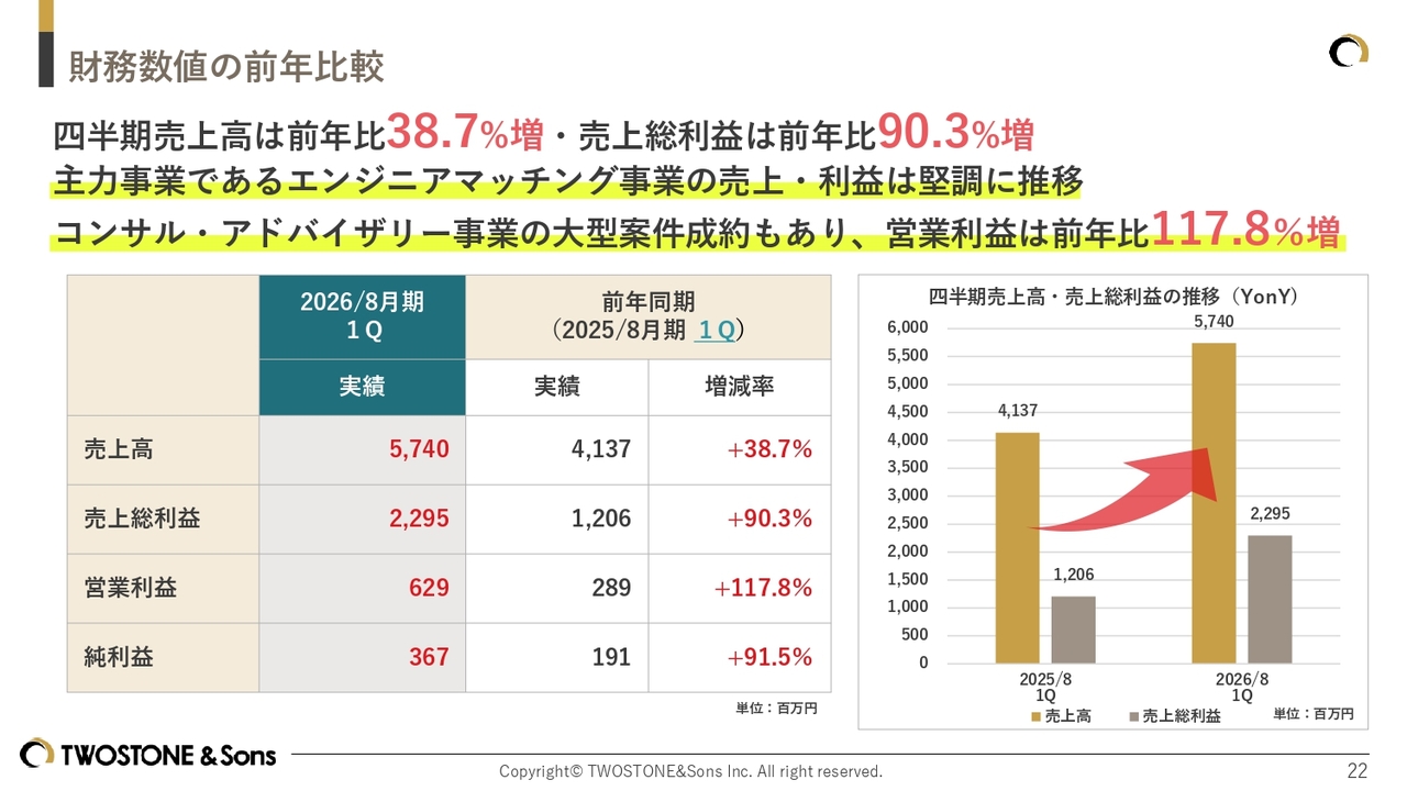 2026年8月期第1四半期の具体的な数字についてご説明します。四半期売上高は前年同期比38.7パーセント増となり、売上総利益は前年同期比90.3パーセント増と、大幅な成長を達成しました。