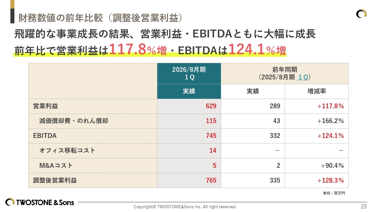 スライドの表に記載されているとおり、2025年8月期第1四半期が4,300万円で、今回が1億1,500万円ですので、のれんの費用は前年同期比で7,000万円ほど増加しています。