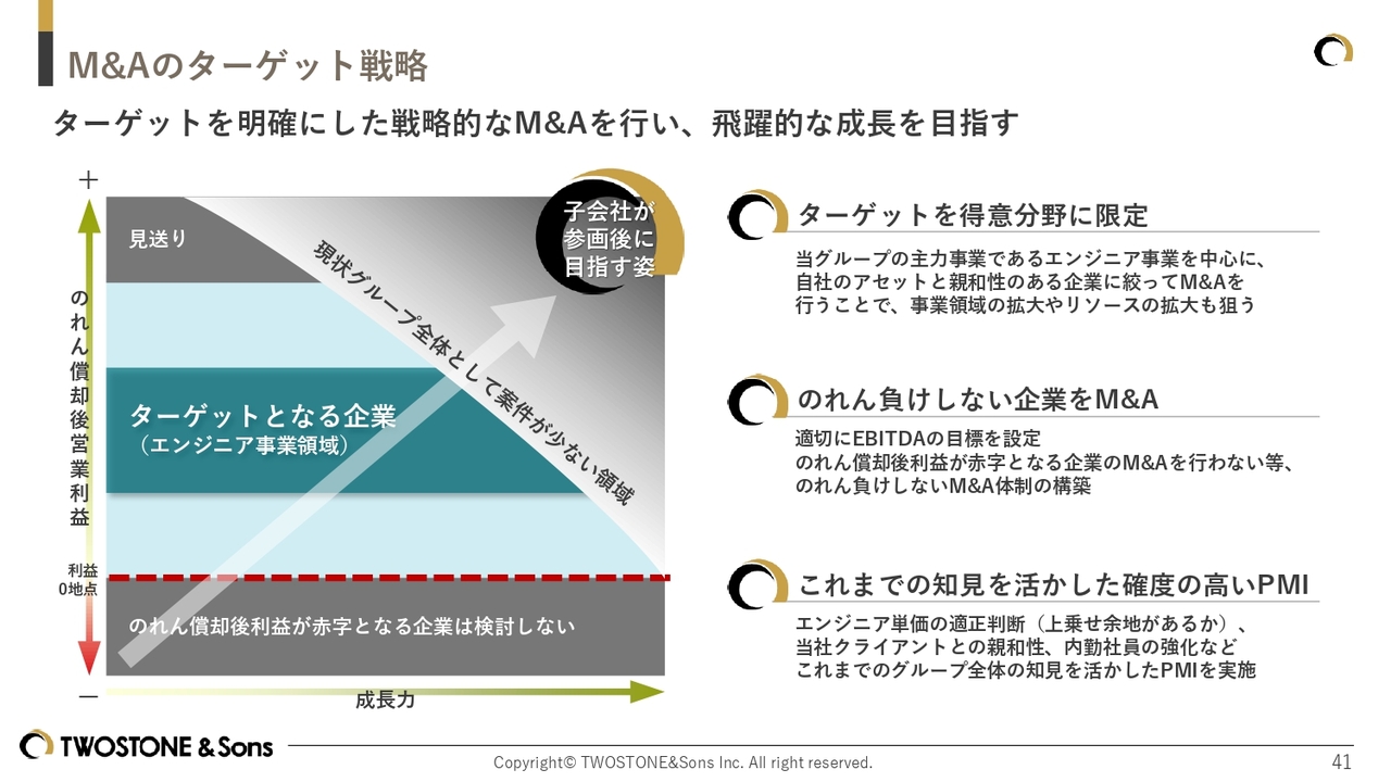 当社としては、社数よりも、どのくらいの金額規模でM&Aできるかのほうが重要だと考えています。そのような意味では、2桁億円を超えるようなM&Aを実施していきたいと考えており、これを一番の目標としています。この目標を達成できるよう努力していきます。