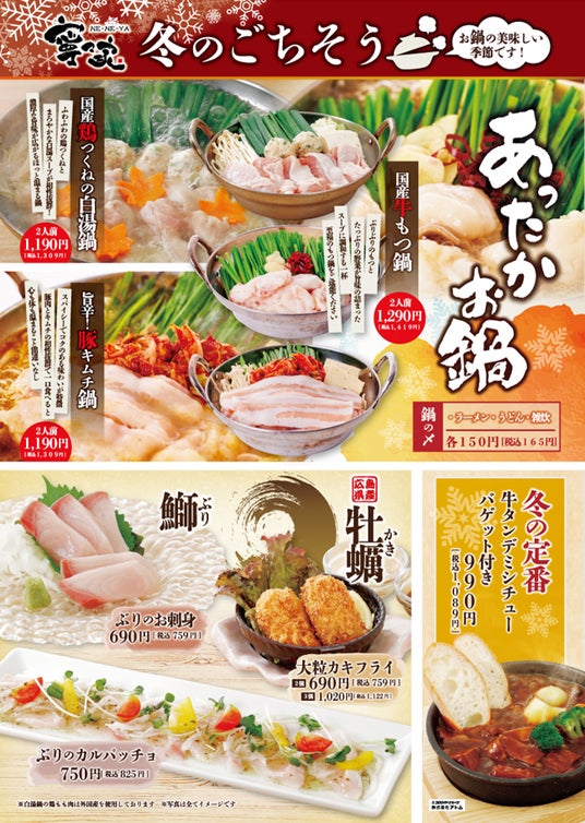 冬の味覚として「大粒カキフライ」を始め、鰤を使用した各種料理や定番あったか鍋をご用意。今年は“寧々家・暖や”で楽しい飲み会を!