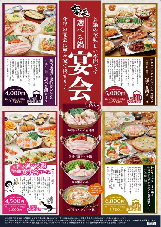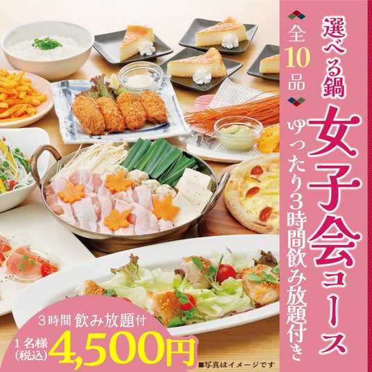 飲み会は久しぶりに「お店で」というお客様にピッタリのコース、飲み放題2時間付き・お料理全9品(選べる鍋付き)コースを4,000円よりご用意。更にグレードの高い4,500円・5,000円コース・6,000円コース、更に女子会コースもご用意!満足・満腹間違いなしです。お鍋はコースに応じて「国産牛もつ鍋」「国産鶏つくねの白湯鍋」「旨辛!豚キムチ鍋」から選択でお楽しみいただけます。