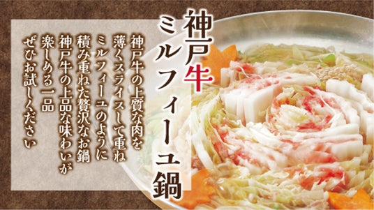 ※神戸牛は人肌で溶けるほど融点が低く、あっさりとして胃もたれしにくいと言われています。薄くスライスしてミルフィーユのようにお肉と白菜を重ねた贅沢なお鍋。コースがいつも以上に豪華に!是非、ご利用下さい。