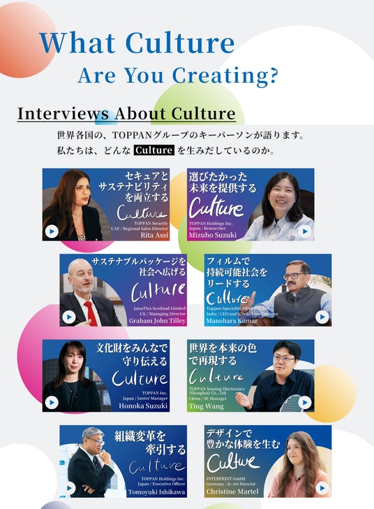 TOPPANホールディングス株式会社(本社:東京都文京区、代表取締役社長 CEO:麿 秀晴、以下 TOPPANホールディングス)は、TOPPANグループのパーパスを構成する重要な要素の1つである「Culture」に焦点を当て、世界各国で活躍する100名以上の社員が、自らの仕事を通じて生みだす多様な「Culture」を紹介するコンテンツを2025年6月5日(木)に公開しました。