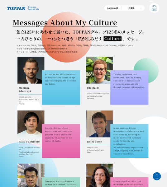 TOPPANグループの創立125周年にちなみ、世界中のTOPPANグループ社員125名が参加するメッセージコンテンツ。社員一人ひとりから寄せられた、多様な「私が生みだすCulture」についてのメッセージと顔写真を掲載しています。
