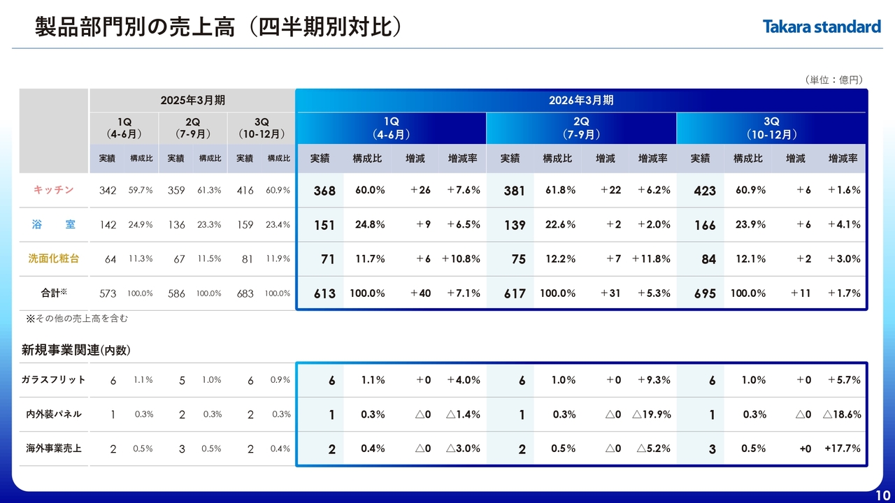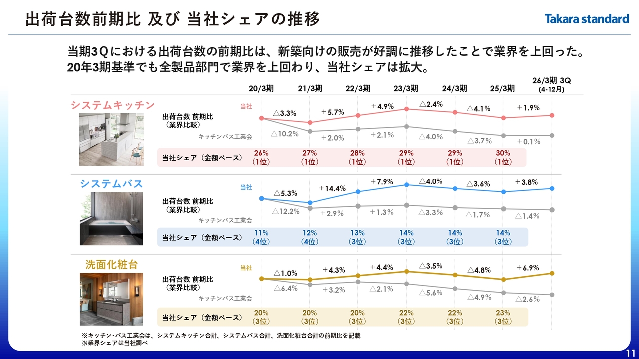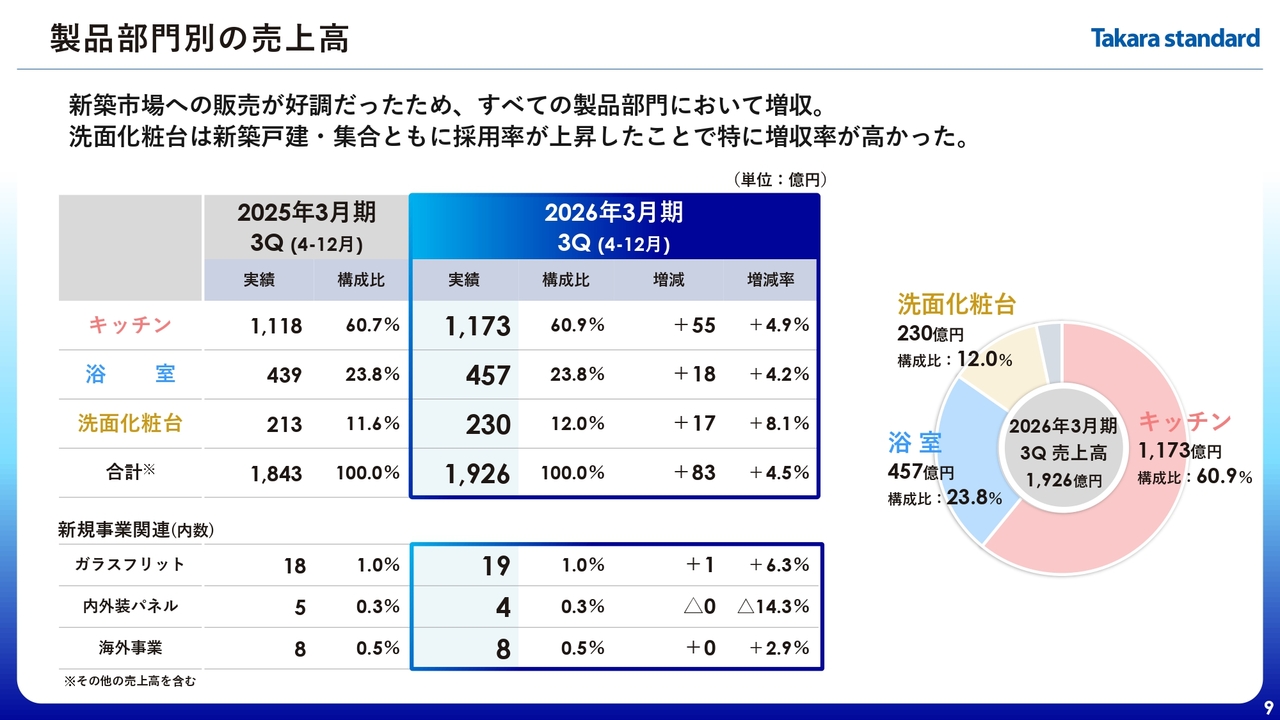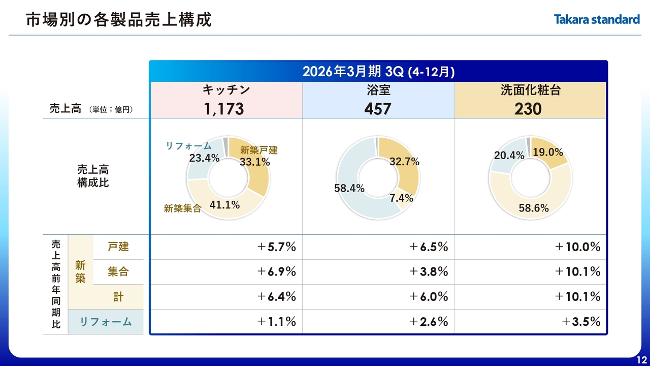 その中で足元は業界全体で伸び悩みがあり、当社としても当初の想定どおりの伸びは示せていないものの、前期の下期以降進めているリフォーム向けのボリュームゾーン商品であるシステムキッチン「トレーシア」、システムバス「グランスパ」の仕様強化やお客さまのニーズに寄り添った商品提案により、増収を確保しました。