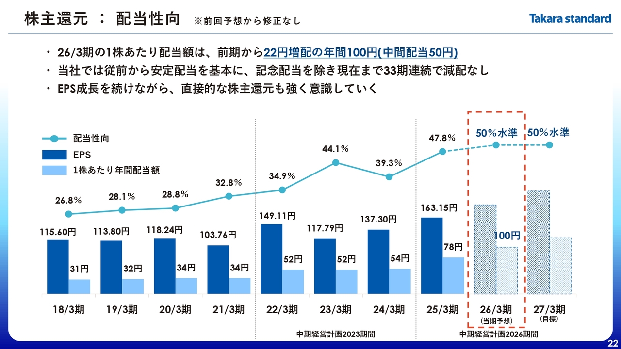 なお、当社は今回の還元策の大幅改定前から33期連続で減配をしないなど、従前より株主さまに安定的な配当を実施していたことは、お伝えしたいと思います。