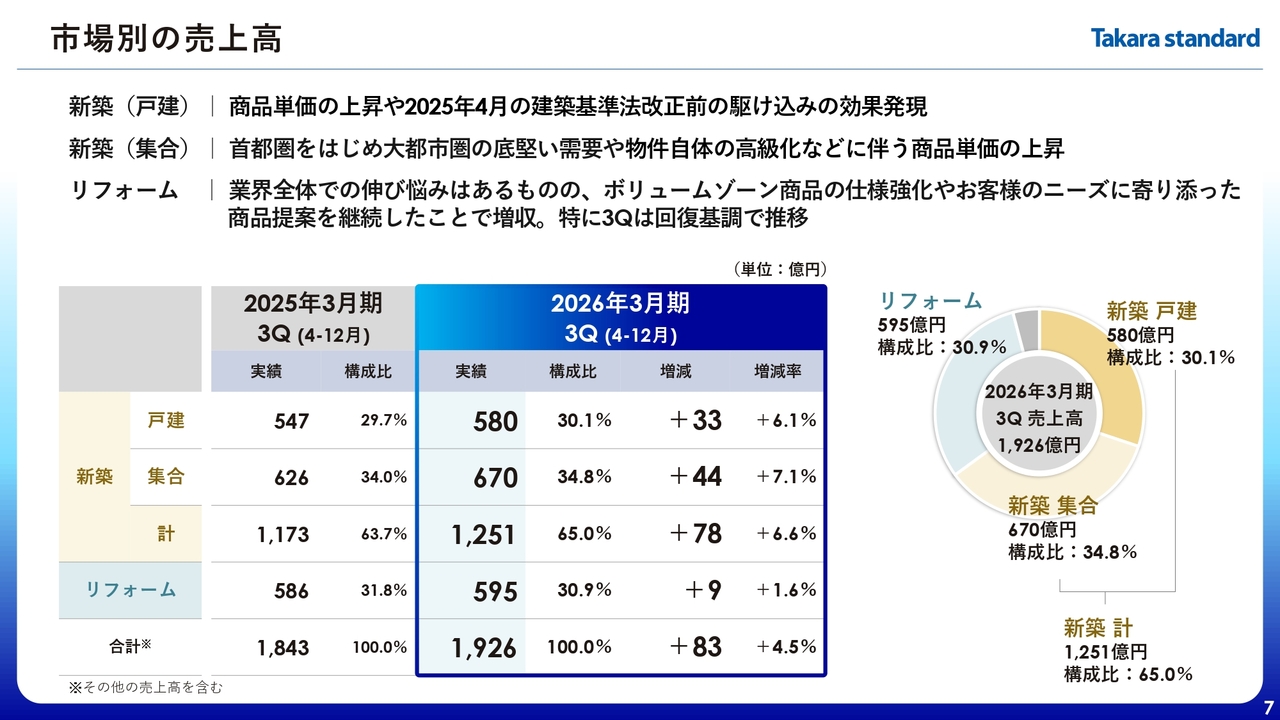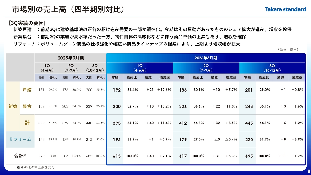 こちらは市場別の売上高を四半期ごとに分解した表です。先ほどご説明したとおり、前期第3四半期は建築基準法等が改正された影響で強い数字が出ていましたが、今期第3四半期は新築戸建でシェア拡大が進むなど、そのハードルを越えてすべての市場で増収を確保できました。