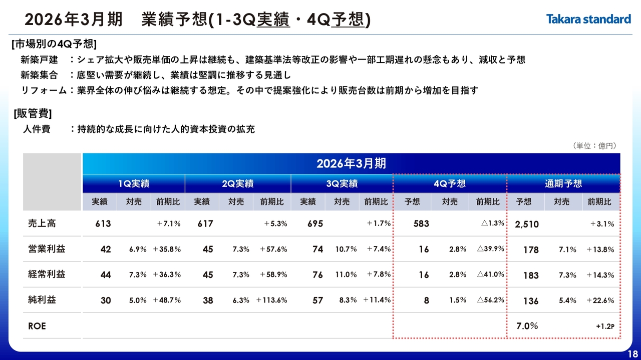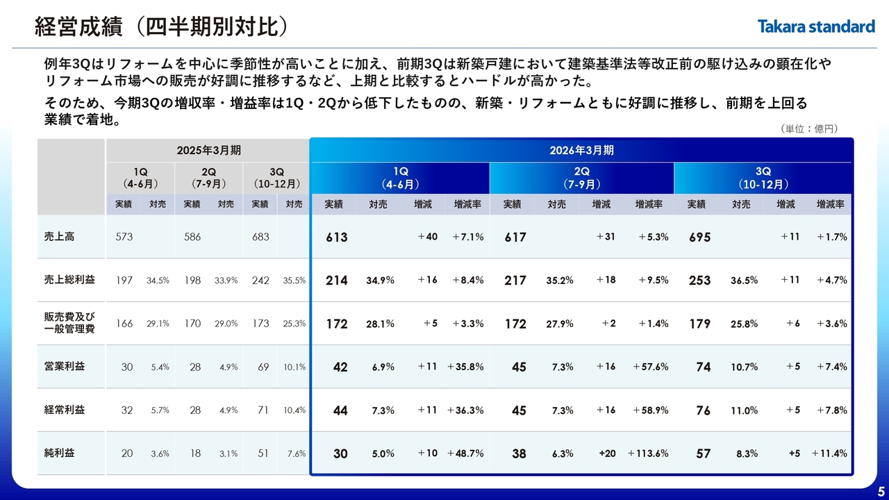 加えて、2025年4月に建築基準法等が改正された影響で、前期第3四半期は売上が通常より強く、前年同期比でのハードルは高かった状況において、第3四半期単独でも増収増益を確保できたことは一定の評価ができると認識しています。